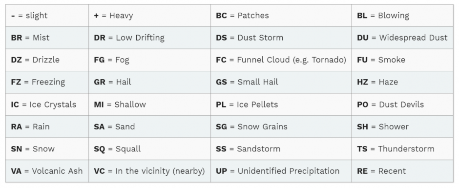 In het weerbericht kunnen deze afkortingen en symbolen worden gecombineerd. -FZDZ staat dus voor slight freezing drizzle en + SHRA voor heavy showers of rain.
